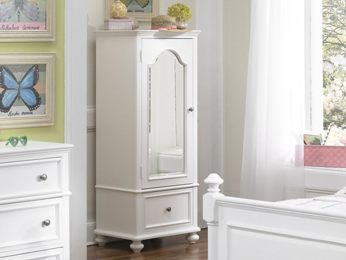 With a single drawer beneath the arched-top, full-sized mirror, the effect is glamorous yet balanced. The mirrored door opens to reveal added storage, including three shelves, a single jewelry drawer, and a removable divider. A sliding garment rod provides additional functionality. This tall piece includes anti-tip hardware for safety, and the nickel finish hardware offsets the Bright White finish nicely.