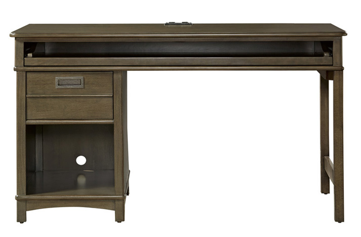 Bedford Falls Desk: Pictured with the Hutch that also coordinates with the Bedford Falls Collection, this Desk offers several tech-friendly features. First, its top includes a built-in electrical outlet. Second, a pull-out tray provides ideal storage for a keyboard. Third, the Hutch includes a 3-way dimmer light that helps illuminate the work area without the clutter of a separate desk light. The work space measures 55 inches wide by 24 inches deep, and the two drawers provide for a variety of storage needs. An added bonus is that the pedestal and leg can be switched to accommodate those who are left-side dominant. Like all of our "smart" desks, it includes a bonus ergonomics guide.