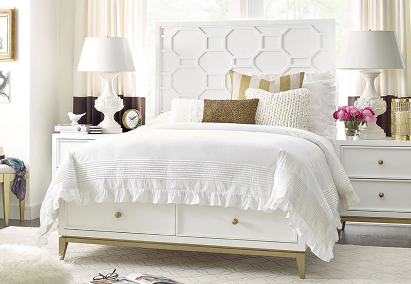 The Tribeca Collection includes 3 bed styles. First, the Tribeca Panel Bed comes in your choice of Twin or Full size. In either size, the headboard is sure to receive a standing ovation. Its impressive size allows the white-on-white lattice design to become the focal point of the entire room. This bed has a solid slat roll foundation that can be used with a low-profile mattress and positioned in your choice of two heights using the secure bolt-on side rails. While the majority of this bed is painted in Pure White, its base stands out thanks to the accent color of Soft Gold.